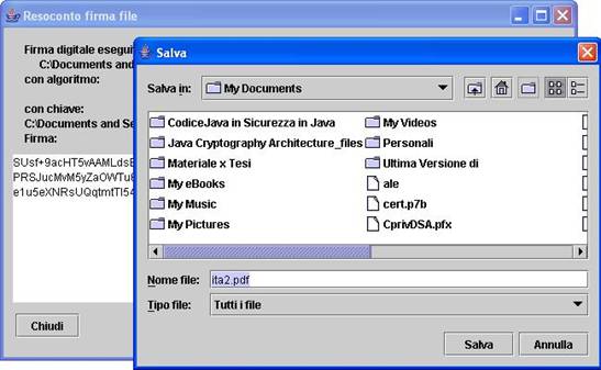 Come si può notare, è possibile anche salvare la firma in un file tramite la pressione del pulsante "Salva". A questo pulsante corrisponde l'apertura di una finestra di dialogo simile a quella vista nel caso del salvataggio delle coppie di chiavi. Di default è previsto un nome da assegnare a questo file; tale nome è recuperato dal nome del file che abbiamo appena firmato con l'aggiunta dell'estensione .sig, come mostrato in Figura ‑ :
