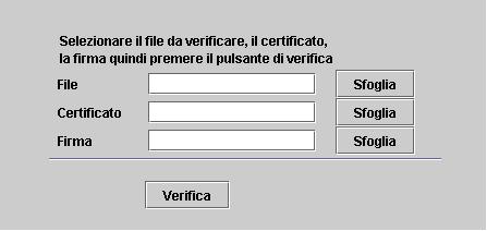 Questa Applet fornisce le funzionalità per verificare la firmare di un documento con l'utilizzo della chiave pubblica, presente nel certificato, associata alla chiave privata utilizzata per la firma. Questa Applet, per funzionare correttamente ha bisogno di tre dati di ingresso, che sono proprio quelli prodotti dall'operazione di firma, più un certificato che garantisca l'affidabilità della chiave pubblica associata. Quindi per funzionare avrà bisogno del file di cui abbiamo calcolato la firma, il file con la firma, e il file con il certificato o la catena di certificazione.