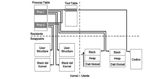 Nello spazio di indirizzamento di ciascun processo, dal basso verso l'alto, trovano posto nell'ordine il testo, i dati, i BSS e poi spazio vuoto fino al limite dello stack, posto in testa allo spazio di indirizzamento: dati due processi che condividono il testo, nella memoria fisica, dal basso verso l'altro, troviamo nell'ordine il SO, il testo condiviso, dati e BSS del primo processo, dati e BSS del secondo processo e poi lo stack.