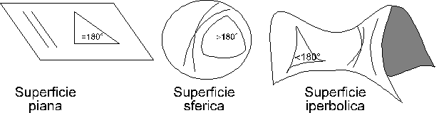 Le superfici iperboliche sono superfici a curvatura costante negativa. Possiamo immaginarle come una superficie 'a sella'. In queste superfici esistono infinite geodetiche che passano per un punto esterno ad una geodetica data senza mai intersecarsi con questa. Tale superficie deve essere quindi descritta tramite una geometria non-euclidea (iperbolica). Costruendo un triangolo con tre archi di geodetica si può verificare come la somma degli angoli interni è minore di 180°.
