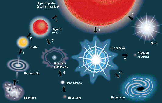 Una stella non è altro che una grossa nuvola di idrogeno che, grazie alla gravitazione, tende a condensare fino a quando l'idrogeno fonde trasformandosi in elio. L'attività di fusione genera energia, in massima parte sotto forma di radiazioni elettromagnetiche, la quale tende a espandere la stella, compensando la gravitazione che, come detto, tende invece a condensarla. Esaurito l'idrogeno come combustibile, comincia la fusione dell'elio ottenuto in precedenza, con un forte aumento dell'energia emessa. Nel ciclo, la nostra stella campione romperà l'equilibrio gravitazione-energia e si espanderà in una gigante rossa.