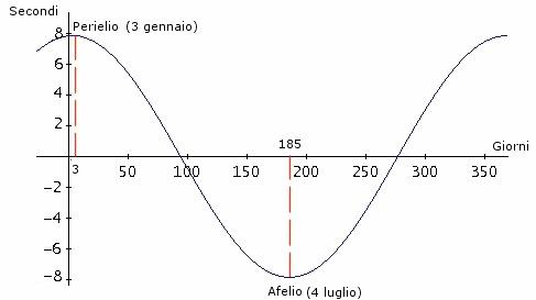 Per rappresentare tale variazione durante tutto l'anno, assumiamo che l'andamento sia sinusoidale (in verità non lo è, ma l'eccentricità dell'orbita terrestre è molto piccola e dunque l'approssimazione è ottima). Inoltre sappiamo che, rispetto al valore medio, avremo la durata massima al perielio (intorno al 3 gennaio), mentre quella minima all'afelio (intorno al 4 luglio). L'ampiezza del coseno è ovviamente la metà dell'escursione totale precedentemente calcolata (15,82/2 = 7,91s). Il ciclo è di un anno tropico (365,2422 giorni solari medi)