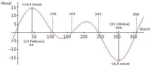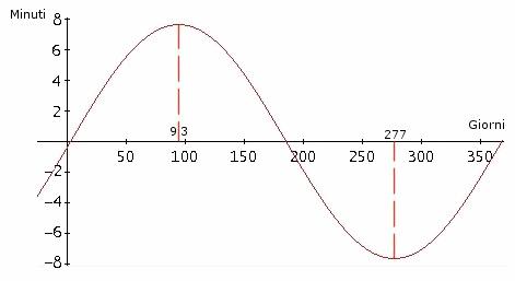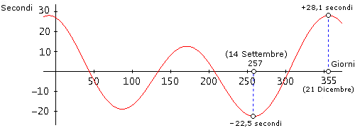 Osserviamo che il giorno solare più corto è il 14 Settembre (circa 22 secondi in meno del giorno solare medio), mentre il giorno più lungo è il 21 dicembre (circa 28 secondi in più del giorno solare medio). Sono differenze piccole, che però si accumulano nel corso dell'anno raggiungendo anche parecchi minuti prima di cambiare segno.