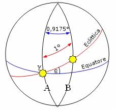 Per rendercene conto immaginiamo che il Sole si trovi nel punto gamma (equinozio di primavera) e che sia in culminazione (mezzogiorno) sul meridiano A. Dopo un giorno sidereo la Terra ha compiuto una rotazione di 360° rispetto alle stelle fisse, ma il meridiano A non ritrova il Sole in culminazione, perché il Sole si è spostato lungo l'eclittica di circa 1°. Poiché tuttavia l'eclittica è inclinata di 23,44° rispetto all'equatore, il sole non si è spostato di 1° in longitudine, ma di 1° cos(23,44°)= 0,9175°. Sarà quindi sufficiente che la Terra ruoti di 0,9175° per ritrovare il Sole in culminazione, impiegandoci dunque non 235,90 s, ma 235,90 x cos(23,44°) = 216,43 s.