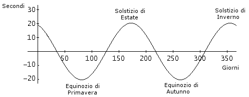 Anche in questo caso, per rappresentare tale variazione durante tutto l'anno, assumiamo che l'andamento sia sinusoidale. Inoltre sappiamo che, rispetto al valore medio, avremo la durata massima in corrispondenza dei solstizi, mentre quella minima agli equinozi. L'ampiezza del coseno è ovviamente la metà dell'escursione totale precedentemente calcolata (40,69/2 = 20,345s). Il ciclo è semestrale (365,2422/2=182,6211 giorni solari medi)