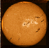 Uno dei piu' estesi gruppi di macchie solari della storia moderna: quello dell'Aprile-Maggio 1947. Le macchie sono aree di attivita' particolare della fotosfera, legate al campo magnetico, che possono durare fino ad alcune settimane e tendono a formarsi con un periodo ciclico undecennale che sembrerebbe influenzare il clima terrestre. Dal loro spostamento regolare Galileo capi' che il Sole ruota sul proprio asse. |