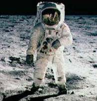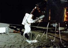 La foto a sinistra è probabilmente una delle immagini più famose dell'intero programma Apollo: la foto di 'Buzz' Aldrin, scattata da Neil Armstrong. Osservate attentamente la sua visiera, potete discernere l'immagine di Neil Armstrong, e giusto alla sua sinistra sembra esserci un oggetto fortemente illuminato sospeso in cielo: cos'è? Qualcuno afferma che si tratti della bandiera statunitense, ma appare troppo lontano dal Modulo ed anche troppo grande. Infine c'è l'ombra del modulo di allunaggio che arriva fino all'orizzonte visibile.