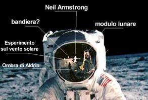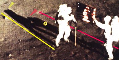 La foto qui accanto mostra gli astronauti Armstrong e Aldrin sul suolo lunare mentre sistemano la bandiera degli Stati Uniti. Notate come l'ombra di uno, nonostante si trovino a pochissima distanza tra loro, è doppia rispetto a quella dell'altro.