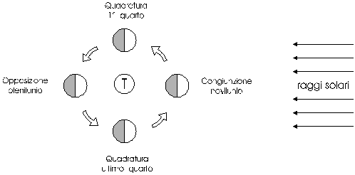 Il moto di rivoluzione lunare fa sì che essa cambi continuamente la sua posizione relativa rispetto al sole ed alla terra. Si individuano usualmente 4 posizioni fondamentali: