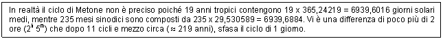 Poichè il mese sinodico dura 29,53 giorni, un anno non contiene un numero intero di lunazioni. In un anno giuliano si possono susseguire 12 lunazioni complete (354,367 gsm) con l'avanzo di circa 11 giorni. Di conseguenza le fasi lunari non si ripetono ogni anno alla stessa data, ma solo ogni 235 lunazioni, corrispondenti a circa 19 anni tropici.