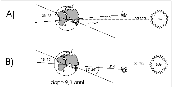 opposto rispetto all'eclittica (A), ad un minimo (dopo 9,3 anni) di 18° 17'