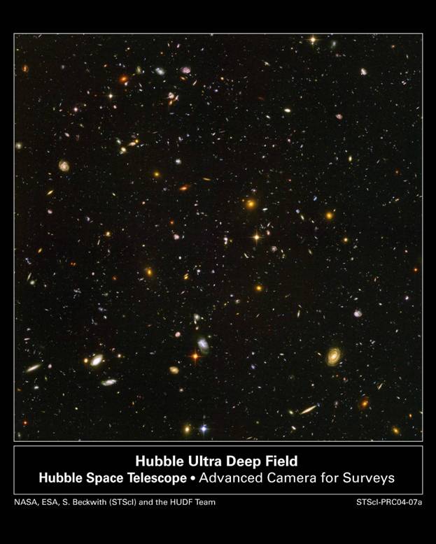 Il campo ultraprofondo dell'Hubble Space Telescope è l'immagine dell'Universo più profonda mai raccolta nelle lunghezze d'onda del visibile. Realizzata dal telescopio in una serie di esposizioni tra Settembre 2003 e Gennaio 2004, essa visualizza una parte dello Spazio così distante che tutti gli oggetti visibili, eccetto una decina di stelle di campo, non possono essere che galassie. Con un'attenta analisi se ne possono contare fino a 10'000. La gran parte di queste distano dalla terra oltre 13 miliardi di anni luce e tutte sono contenute in un'infinitesima area pari ad una parte su tredici milioni della sfera celeste. Fino a 90 anni fa si pensava che la Via Lattea fosse l'unico aggregato di stelle esistente e completante il Cosmo.