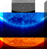 Pennacchi di gas caldo che fuoriescono dal Sole, forse sorgenti di vento solare e di particelle cariche. Dall'alto verso il basso: il campo magnetico vicino al polo sud solare; immagine ultravioletta di un pennacchio alla temperatura di un milione di gradi, nella stessa regione; immagine ultravioletta di una regione di atmosfera solare piu' qiueta e vicina alla superficie . (ESA/NASA) |