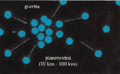 Contemporaneamente alla fase di condensazione in granuli inizia la caduta delle particelle verso il piano mediano della nebulosa con la conseguente formazione di un sottile e denso disco di polveri. E' in questo disco di materia generatosi nel piano centrale che, alla temperatura di circa 700 K e alla densità di 7,5x10-10 g/cm3, si sviluppano le instabilità gravitazionali responsabili dei fenomeni successivi.