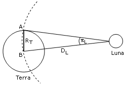 Misurando l'entità di tale angolo di parallasse è dunque possibile calcolare la distanza Terra Luna (DL) espressa in Raggi terrestri. Il raggio Terrestre può essere infatti approssimato all'arco AB posto sulla circonferenza di raggio DL. Il rapporto RT/DL è dunque pari alla parallasse lunare espressa in radianti. E dunque DL, espresso in raggi terrestri, è semplicemente il reciproco della parallasse lunare espressa in radianti.