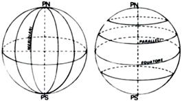 Coordinate: latitudine (φ),misura angolare dell'arco di meridiano compreso tra il parallelo passante per il punto e l'equatore; longitudine (λ), misura angolare dell'arco di equatore compreso tra il meridiano passante per il punto e il meridiano fondamentale (Greenwich).