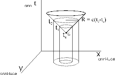 Se intersechiamo un cono di luce con piani perpendicolari all'asse del tempo otteniamo una rappresentazione bidimensionale (circonferenze) di tutte le regioni dello spazio che in quel momento sono colpite dalla radiazione luminosa. Ciascuna circonferenza presenta un raggio uguale al percorso effettuato dalla luce dal tempo di emissione (te) al momento considerato (tx), pari quindi a c(tx - te