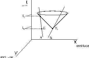 Se rappresentiamo due dimensioni spaziali (x ed y) le linee di universo rimangono tali, con in più naturalmente la libertà di muoversi in due direzioni, mentre gli impulsi luminosi, che si propagano radialmente in tutte le direzioni, vengono rappresentati come dei coni, detti coni di luce.