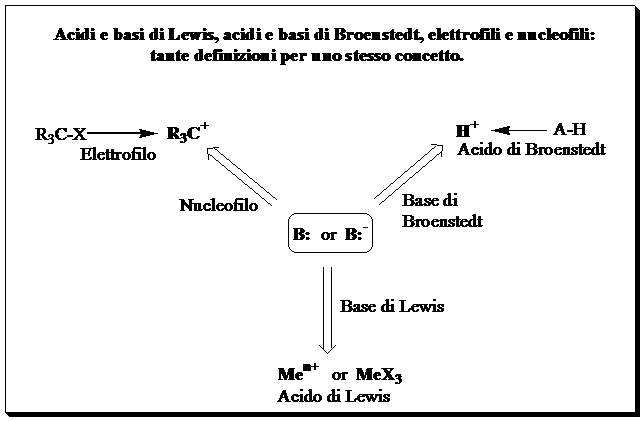 Acidi di Lewis: sostanze contenenti un atomo con una lacuna elettronica (orbitale vuoto). Possono essere sostanze neutre, come i composti degli elementi del 3° gruppo (BL3, AlL3), o cationi (Li+, Na+, Mg++, Ca++). Gli acidi di Lewis possono colmare la lacuna elettronica coordinando una sostanza contenente un atomo con un doppietto di non legame (base di Lewis). Per questa caratteristica sono composti elettrofili.