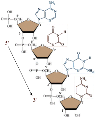 Come abbiamo già visto l'RNA è costituito da una catena di nucleotidi in cui lo zucchero è il ribosio e la Timina è sostituita dall'Uracile. La complementarietà delle basi è in questo caso Adenina-Uracile e Citosina-Guanina.