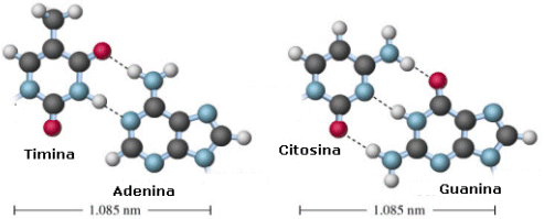L'abbinamento fra i nucleotidi può realizzarsi soltanto tra basi cosiddette complementari, cioè fra adenina e timina, mediante due ponti a idrogeno (A=T), o tra citosina e guanina, mediante tre ponti a idrogeno (C≡G).