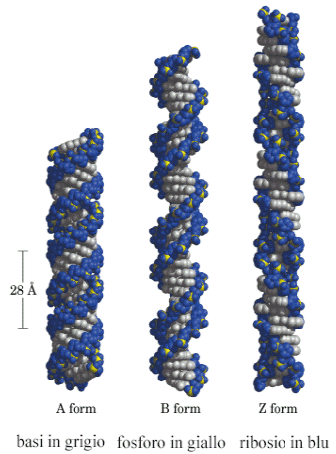 La struttura A non esiste in vivo e corrisponde alla molecola disidratata ed è più compatta. Contiene 11 basi per giro, presenta un diametro di 2,4 nm ed un passo di 2,6 nm.