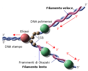 Un filamento, detto filamento veloce (leading strand) viene sintetizzato in modo continuo, poiché la DNA-Polimerasi avanza nella stessa direzione dell'elicasi.