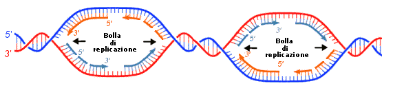 La duplicazione del DNA avviene contemporaneamente in più punti della molecola, con le forcelle di replicazione che si allontanano in direzioni opposte formando bolle di replicazione, destinate ad estendersi ed a fondersi.
