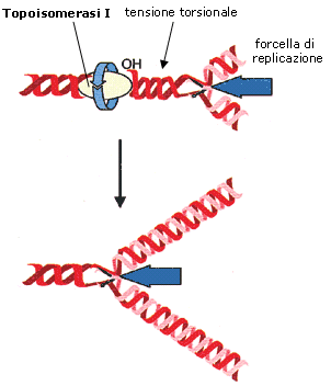 Mentre la bolle di replicazione crescono i filamenti di DNA non ancora aperti tendono a manifestare una tensione torsionale aumentando il numero di spire per unità di lunghezza (si pensi a cosa accade ad una treccia se tiriamo le estremità dei fili divaricandoli). Le topoisomerasi di classe I risolvono il problema della tensione causato dall'avanzamento dell'elicasi tagliando periodicamente uno dei due filamenti e permettendo all'elica di girare, per svolgere gli avvolgimenti in eccesso. Quando il DNA si è rilassato, la topoisomerasi riconnette il filamento rotto, ripristinando il DNA a doppia elica.