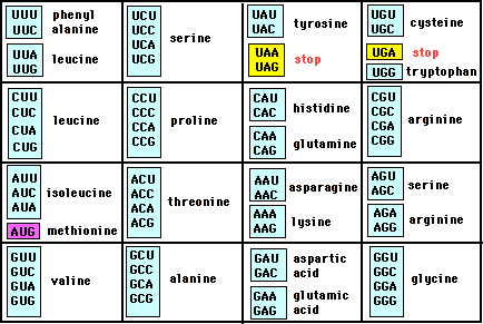Ciascun amminoacido viene dunque "codificato" da una particolare tripletta di basi o codone. I codoni sono le triplette già trascritte nella molecola dell'RNA messaggero e quindi con l'Uracile al posto della Timina.