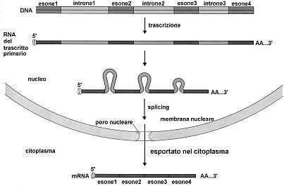 Negli eucarioti la trascrizione genera dei precursori nucleari degli mRNA (trascritti primari) caratterizzati dalla presenza di zone non codificanti o introni (intron = intragenic region). Tali precursori vengono in seguito convertiti negli mRNA maturi attraverso un processo (splicing) che prevede la rimozione degli introni e il ricongiungimento delle parti codificanti o esoni (exon = expressed region). Lo splicing avviene grazie a un apparato enzimatico complesso (spliceosoma) in grado di riconoscere sequenze specifiche presenti nelle zone di giunzione esone-introne, di rimuovere gli introni e di ricongiungere correttamente tra loro i vari esoni.