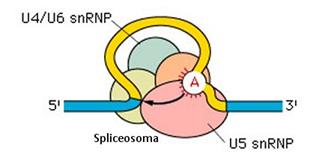 Il successivo aggancio delle altre snRNP (U4/U6 e U5) costringe l'introne a formare un cappio in modo che le sue estremità di taglio si avvicinino. L'apparato enzimatico costituitosi, formato dal complesso di tutte le snRNP è detto spliceosoma.