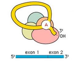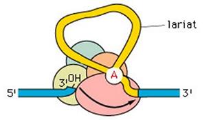 Lo spliceosoma taglia l'estremità 5' e connette l'estremo libero dell'introne all'Adenina del sito di ramificazione, andando a formare un cappio chiuso noto come 'lariat'.