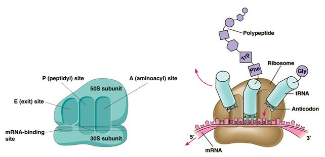 La subunità maggiore è la principale macchina catalizzatrice del complesso. Quando sono unite le due subunità possiedono tre siti d'attacco per i tRNA: