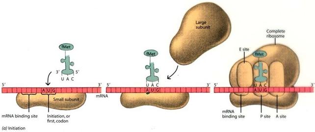 Nella fase di inizio (initiation) la subunità minore del ribosoma aggancia l'estremità 5' dell'mRNA e si posiziona sul codone d'inizio (AUG) della traduzione. Successivamente si posiziona la subunità maggiore.