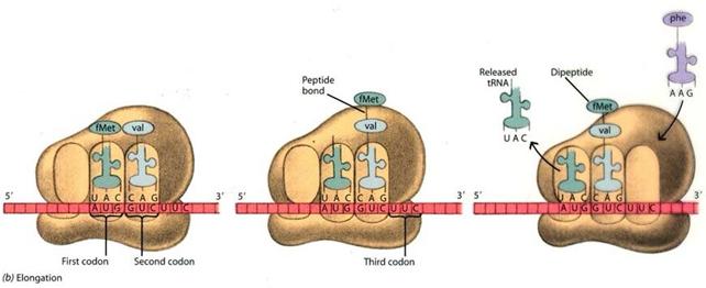 Nella successiva fase di allungamento (elongation) della catena proteica Il secondo amminoacil-tRNA si posiziona nel sito A. In questo modo il suo amminoacido risulta adiacente a quello portato dal primo amminoacil-tRNA