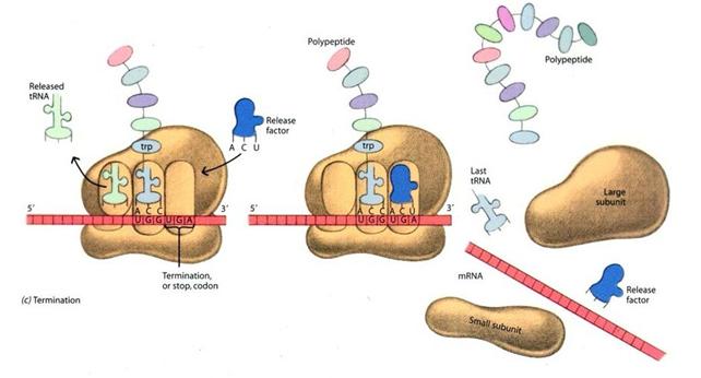 Il processo termina (termination) quando il ribosoma trova un codone di stop, in corrispondenza del quale si lega un fattore di rilascio. Il filamento proteico si stacca e viene liberato nel citoplasma dove assume la sua conformazione nativa.