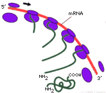 Nella fase di traduzione, l'informazione genetica, contenuta nell'RNA messaggero come sequenza di codoni (triplette di basi), viene letta dai ribosomi in direzione 5' → 3' e trasformata nella corrispondente sequenza di amminoacidi, in direzione N-terminale → C-terminale, grazie al codice genetico.