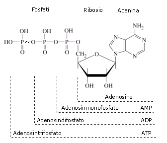 L'ATP (Adenosin Trifosfato) viene utilizzato dalle cellule come contenitore e trasportatore di energia. L'ATP deriva dall'AMP (Adenosin Monofosfato = Adenina-Ribosio-Fosfato) per aggiunta di due molecole di acido fosforico.