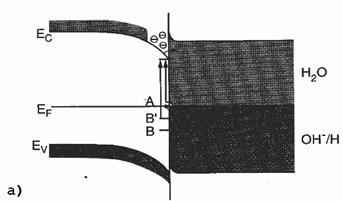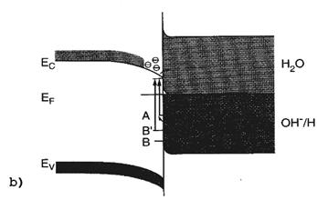 Fig. 1: Diagramma a bande dell'interfaccia silicio/elettrolita nel caso di drogaggio p (a) o n (b).