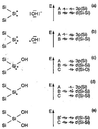Gli stati superficiali che svolgono un ruolo molto importante nel modello di Seidel sono quelli corrispondenti ai doppietti spaiati (A) ed ai legami Si-Si rivolti verso il cristallo (B) negli atomi superficiali, e quelli corrispondenti al legame Si-O nei prodotti di reazione (C): la posizione relativa degli stati superficiali rispetto ai limiti di banda è indipendente dal tipo di drogaggio.