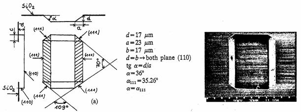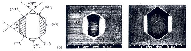 Fig. 1: Scavo nel Si (110), a partire da (a) una maschera quadrata, e (b) una maschera circolare. (Bibl. 1)