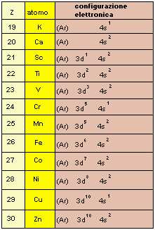 Fig.9.3 Configurazione elettronica degli atomi con numero atomico da 19 a 30. K e Ca hanno rispettivamente 1 e 2 elettroni nel 4s. Poi, con lo scandio Sc, iniziano a riempirsi i 3d (3d1 4s2). Seguono titanio Ti e vanadio V (3d2 4s2; 3d3 4s2). Ma quando si arriva a Cr, che dovrebbe avere la configurazione 3d4 4s2, si nota un'anomalia: la configurazione è 3d5 4s1. Questo avviene perché la configurazione elettronica che comporta una serie completa di orbitali degeneri completamente piena o piena a metà (cioè con un elettrone in ogni orbitale) è energeticamente favorita, tanto da utilizzare uno degli elettroni 4s per completare il quintetto. La stessa cosa avviene con Cu, che si trova con tutti i 3d completi, utilizzando 1 elettrone 4s (configurazione 3d10 4s1). Avremo perciò due atomi con 5 elettroni 3d, Cr e Mn, e due atomi con 10 elettroni 3d, Cu e Zn. Cr e Cu, avendo un solo elettrone s, avranno perciò comportamento chimico diverso (diverse valenze) rispetto ad altri atomi con Z vicino al loro. |