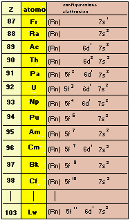 Fig.9.4 Configurazione elettronica degli atomi transuranici. Gli orbitali 6d vengono utilizzati infatti saltuariamente; dopo l'inserimento dei 2 elettroni 7s, (che avviene col radio Ra) gli elettroni successivi vanno nei 5f o nei 6d a seconda della stabilizzazione che è possibile ottenere. Così potremo avere in sequenza 6d2 7s2 (per il torio Th) e 5f2 6d1 7s2 (per il protoattinio Pa). E ancora 5f4 6d1 7s2 (per il neptunio Np), 5f6 7s2 (per il plutonio Pu), 5f7 7s2 (per l'americio Am) e 5f7 6d1 7s2 (per il curio Cm). Anche qui due configurazioni successive hanno tutti gli orbitali degeneri con un solo elettrone, cioè pieni a metà: Am e Cm. (Ricordare che gli orbitali f sono 7!). (Rn) sta per la configurazione elettronica del radon Rn, ultimo dei gas nobili, con Z=86; la configurazione elettronica completa del Rn è la seguente: 1s22s22p63s23p63d104s24p64d104f145s25p65d106s26p6 è chiara l'utilità di usare il simbolo anziché la notazione completa. |