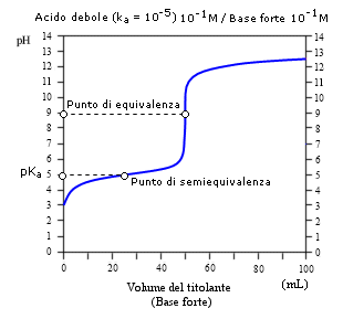 La curva di titolazione (pH contro titolante) che si ottiene in questo modo, mostra un flesso orizzontale che permette di individuare il punto di semiequivalenza ed il relativo pH ( e quindi il pK dell'acido debole)
