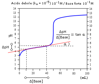 Si noti come in corrispondenza del punto di semiequivalemza la curva di titolazione presenti una pendenza molto piccola, proprio a causa del comportamento tampone della soluzione. In altre parole, a grandi variazioni di base forte aggiunta alla soluzione (Δ[Base] grande), corrispondono piccole variazioni di pH (ΔpH piccolo).