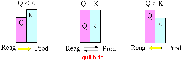 Se Q > K il numeratore (prodotti) è troppo elevato e la reazione si sposterà verso sinistra (verso i reagenti) finché non verrà soddisfatto l'equilibrio