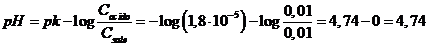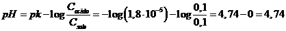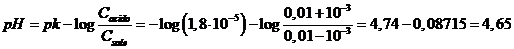 Stimiamo ora la capacità tampone di una soluzione più diluita, 0,01 M in acido acetico (Ka = 1,8 10-5) e 0,01 M in acetato di sodio. Poichè il rapporto tra Ca/Cs = 1, il pH di tale tampone è uguale a quello dell'esempio precedente