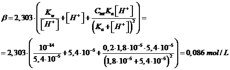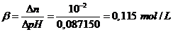 Poiché l'aggiunta di 10-2 moli per litro di soluzione hanno fatto variare il pH di 0,087150, la capacità tampone è