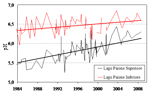 Fig.40 Trend relativo ai dati di pH nei laghi Paione. |